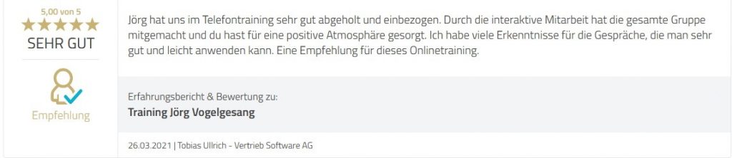 Wir vom IFM finden, dass es genug theoretische Telefontraining und praxisferne Schulungen gibt. Wir schaffen es, Menschen direkt im Online Telefontraining auf dem Weg zu mehr Sicherheit und Erfolg zu begleiten. Unser Versprechen: 100% Praxis mit dem Online-Telefontraining. Hier ein Feedback, dass der IFM-Trainer Jörg Vogelsang nach einem erfolgreichen Online-Telefontraining mit anschließendem Online Coaching von der Software AG erhalten hat.
